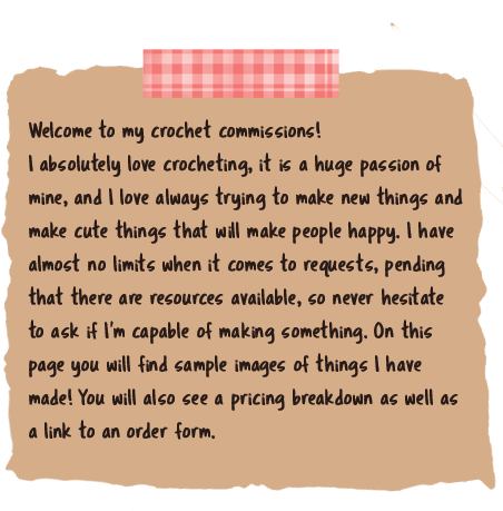 My pricing is based primarily off the size of objects I make when it comes to amigurumi/plush toys. I typically use a #4 worsted/aran weight yarn in my projects. If you would like your item to be made in a more chunky/bulky yarn, the pricing may be subject to change due to material cost. Color is typically customizable! If I do not have a color that you want, your project may take a little longer to make due to me having to go and get the adequate materials. These prices do not include shipping costs, although I always try to keep shipping below $20USD (however, this is heavily based on the size of your projects).If your commission requests includes a lot of detail work, the price may increase due to complexity. I will always discuss the details of your commission with you before beginning anything!All prices are in USD. I accept payment through bank transfer and PayPal.